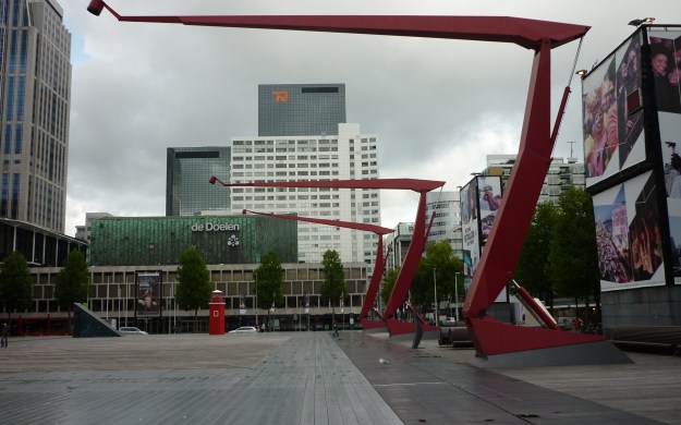 “Gevormde leegte” noemde Hans van Dijk (Archis 4-1997) het. “Ongezellig” horen we uit de meeste Rotterdamse monden. In de Hollandse motregen ben je geneigd het met de Rotterdammers eens te zijn. Het podium is toch vooral het dak van een parkeergarage. Rond het plein zit je tegen een dakrand aan te kijken. De verlichting is spectaculair dat zeker. Een referentie aan de havenkranen waar Rotterdam haar centen mee verdiend. Misschien zijn daarom die havenkranen wel zoveel mooier dan deze replica’s.