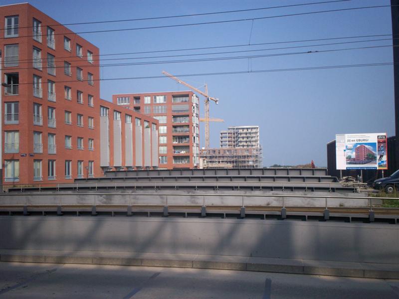 De bruggen over de grachten zijn onder architectuur gebouwd. Niet door een ingenieur van rijkswaterstaat maar door een echte architect. Ze markeren het punt waar weg en water elkaar ontmoeten. Tussen de verschillende rijbanen, tussen tram, autoweg, fietspad, voetpad staat telkens een massief stalen plaat. Hoe wijdser het uitzicht over het water hoe hoger de staalplaat. Bij al dat markeren is het uitzicht verloren gegaan. Van het water geen spoor. Jammer.