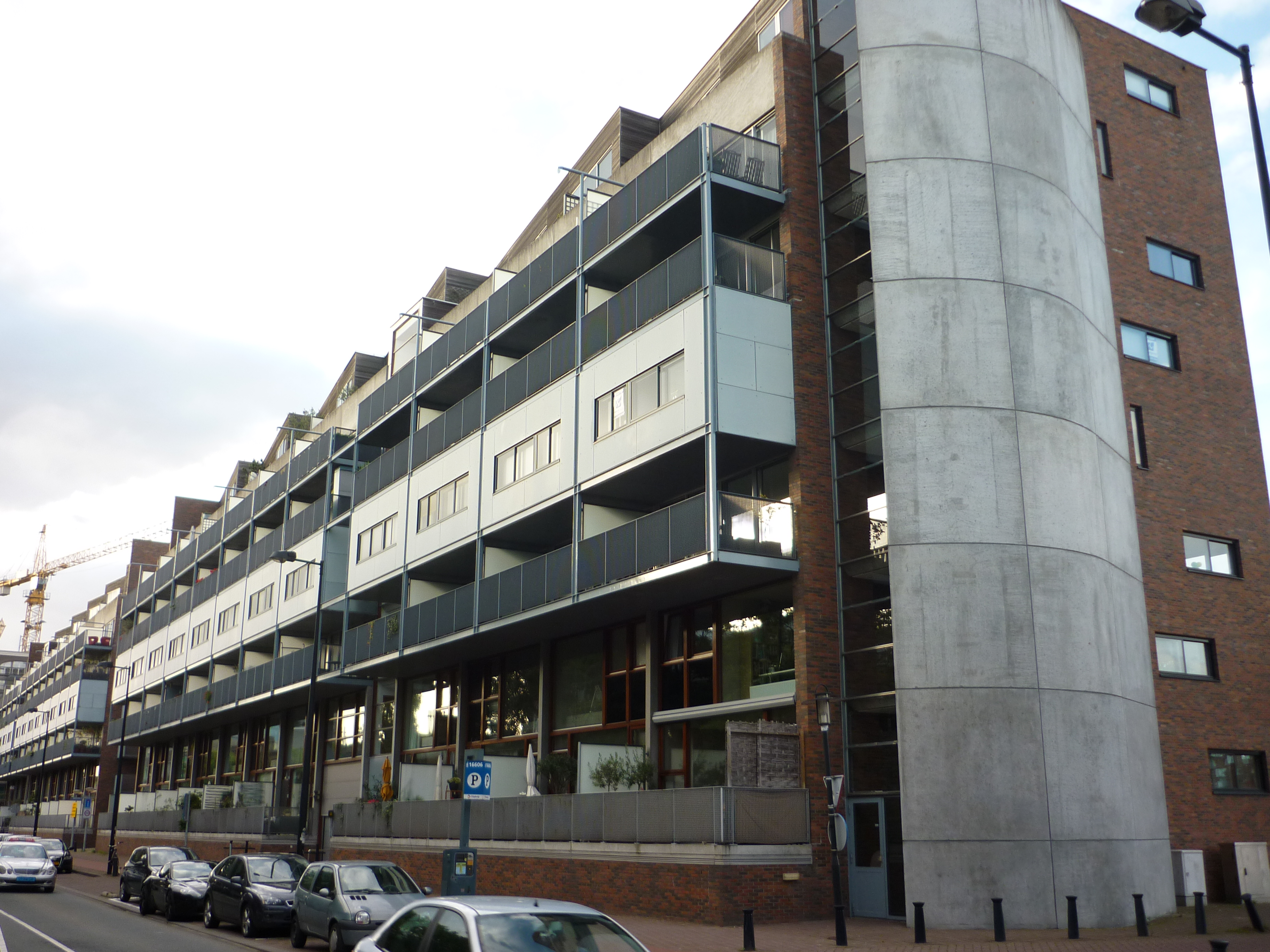 De eerste nieuwbouw aan de Oostelijke Handelskade. Tussen Centraal Station en de Oostelijke eilanden stonden alleen een paar gekraakte pakhuizen. Frits van Dongen ontwierp twee blokken die de ruigheid van het gebied koppelden aan luxe woningen. Door de oogharen is het een containerschip dat even vergeten was dat de Amsterdamse havens naar het westen zijn verplaatst om het oostelijk havengebied aan de stad terug te geven. Open en gesloten grijze containers met daar bovenop een stel houten palets. Ingeklemd tussen kopgevels van bruine baksteen. Even bruin als de oude pakhuizen en later de steenkleur waar heel Borneo Sporenburg uit is opgetrokken. De hele Oostelijke Handelskade is inmiddels gevuld. De nieuwbouw van Breitner en Breitner direct naast my side doet een poging eruit te zien of het er altijd al gestaan heeft. De oude pakhuizen zijn opgepoetst tot vriendelijke lofts. Gelukkig herinneren de blokken van Frits van Dongen eraan dat dit ooit een ruig gebied was.