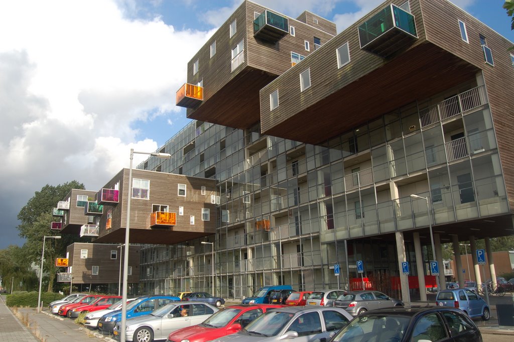 Spectaculair zijn de aanhangwoningen boven de Ookmeerweg. Ze hangen aan een galerijflat waar er duizenden van zijn in Amsterdam West. Dit is de enige flat van al die duizenden die ooit alle architectuurbladen ter wereld haalde. MVRDV trok Hollandse nuchterheid tot in het absurde. Er moesten meer appartementen komen dan er in de hoogte en de breedte pasten. Dan hangen we ze gewoon aan de galerij dachten M, vR en dV. Zo gezegd zo gedaan. Beangstigend ver steken de appartementen uit. Met de jaren werd dat steeds angstiger. De houten gevelbekleding leek ieder moment van ellende naar beneden te komen. De dure constructie werd gerealiseerd met de goedkoopste materialen. Nu 15 jaar later nieuwe houten planken op de gevel zijn gezet en de kozijnen opnieuw gekit kan het er weer even tegen. Dankzij die dure renovatie kunnen we niet meer van goedkoop effectbejag spreken.