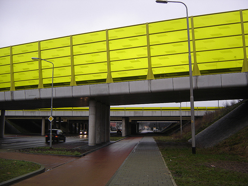 Door een gele zonnebril ziet de wereld er veel beter uit. Overal lijkt de zon te schijnen. Dat moet ook bij een geluidsscherm werken zullen ze bij UN Studio gedacht hebben. ’s Hertogenbosch was voor de inrichting van de ringweg te rade gegaan bij de ontwerpers van onder andere de Erasmusbrug en het Mercedes-Benzmuseum. UN Studio kwam met de gele steunkleur voor al het metaalwerk en voor de geluidsschermen die anders binnen de kortste keren grijs van de roetdeeltjes zien. Het moet gezegd, grauw kijkt het allerminst. Vanaf de A2 baadt de stad het hele jaar door in een zinderend gele gloed. Zelfs van onder de viaducten is voelbaar hoe het snelverkeer daarboven met 130 per uur van Amsterdam naar Palermo zoeft. Misschien wordt het tijd voor een prijsvraag onder bosche inwoners. Maak de volgende zin af: Al heeft Den Bosch een gele ring, het is en blijft…