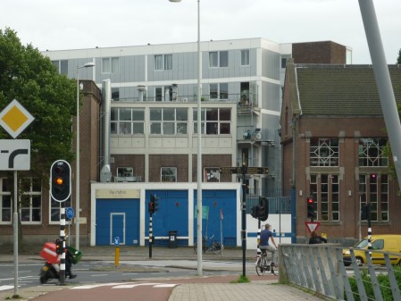 De achterkant op de foto is het stiefkindje van het project. Per ongeluk piept ze te voorschijn. Hoog boven de panden aan de Zeeburgerdijk, pal in de as van de Panamalaan. Nu is het natuurlijk makkelijk om een verhaal op te hangen over schortjesarchitectuur en gevelfetisjisme. Interessanter is de vraag waar deze keuze vandaan komt. Was het omdat de commissie welstand alleen de voorgevel had beoordeeld? Was het omdat de corporatie niet in de achtergevel wenste te investeren? Was het een bezuinigingsronde waarbij de architect bakzeil haalde? Of is het een bewuste keuze?
