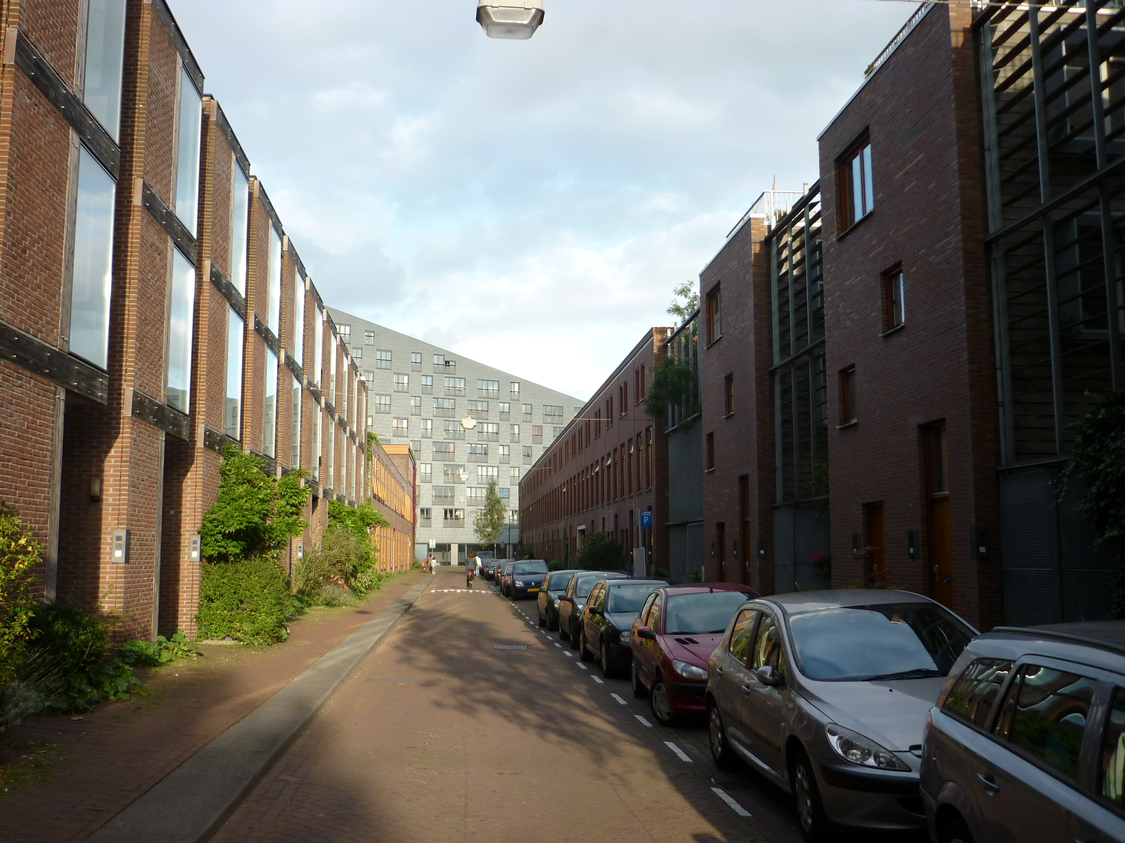 Op Borneo Sporenburg nam Adriaan Geuze het profiel van de oude arbeiderswijken over. De smalle straten van de Pijp en de Jordaan. Op de plek waar vroeger de werkplaats zou hebben gezeten kwam nu de carport. Via patio’s en dakterrassen komt net voldoende lucht en licht binnen om aan nieuwbouweisen te voldoen. De woningen zijn opeengepakt als pandjes in het oude centrum maar in plaats van een bouwval wel gloednieuw. Het werd meteen één van de populairste wijken. Niet alleen voor yuppen. De young urban people werden al snel dinki’s (double income no kids) en zelfs de kids lieten niet lang op zich wachten. De gezinnen bleven! De dynamiek van de grote stad heeft de oostelijke eilanden nog niet veroverd maar als op een zomerdag de kinderfietsjes en de zwembadjes naar buiten geschoven worden bruist het zeker.